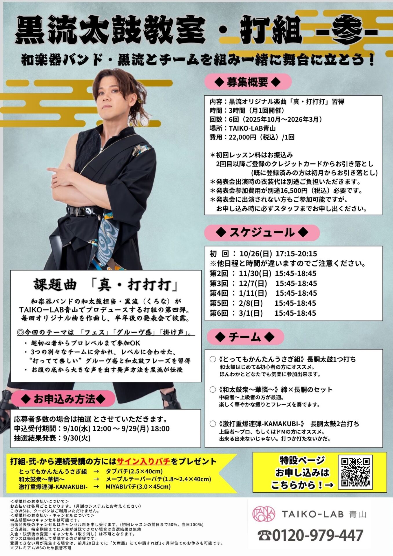 ・お支払いは各月ごととなります。(月謝のシステムとお考えください)TAIKO-LABに口座のご登録がない方は初回レッスン料はお振込みにてお支払いください。