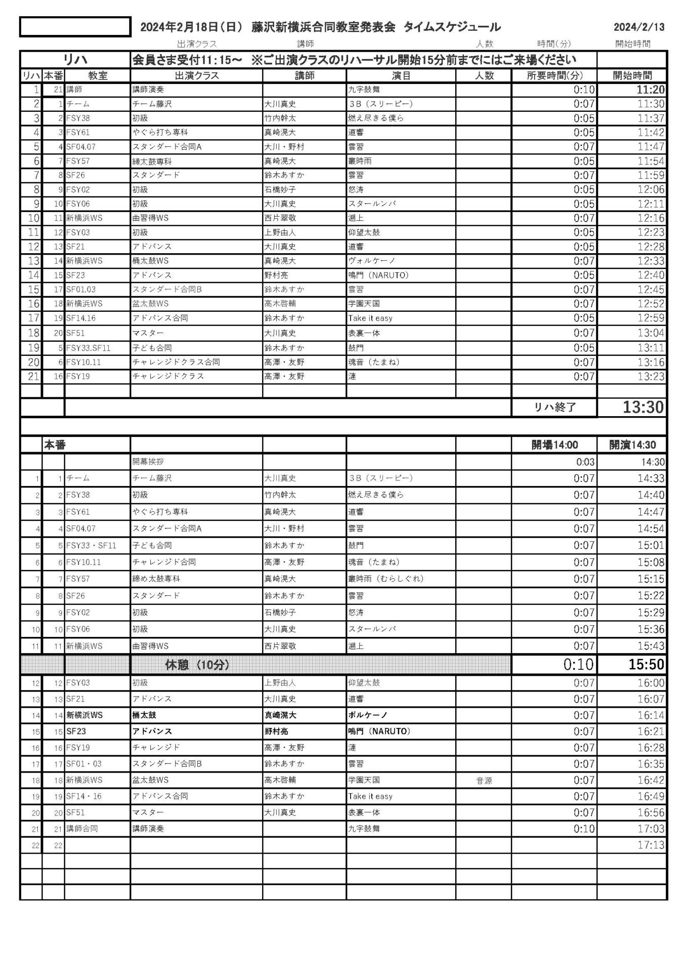 出演クラスのリハーサル開始予定時刻15分前にはホール内にお集まりください。