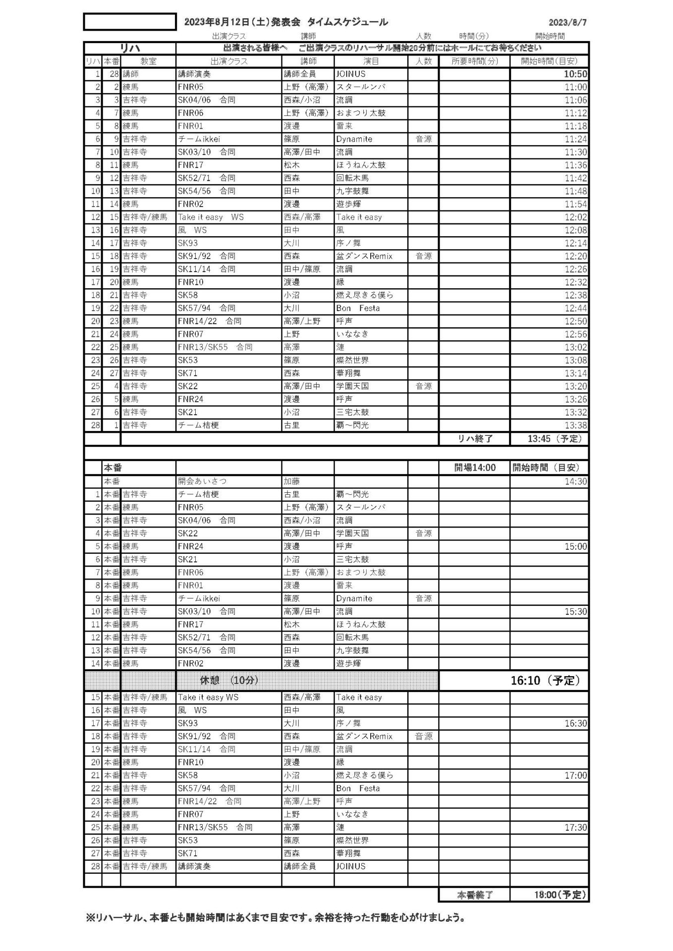 ご自身の出演クラスのリハーサル開始時間の20分前ホールにお集まりください。