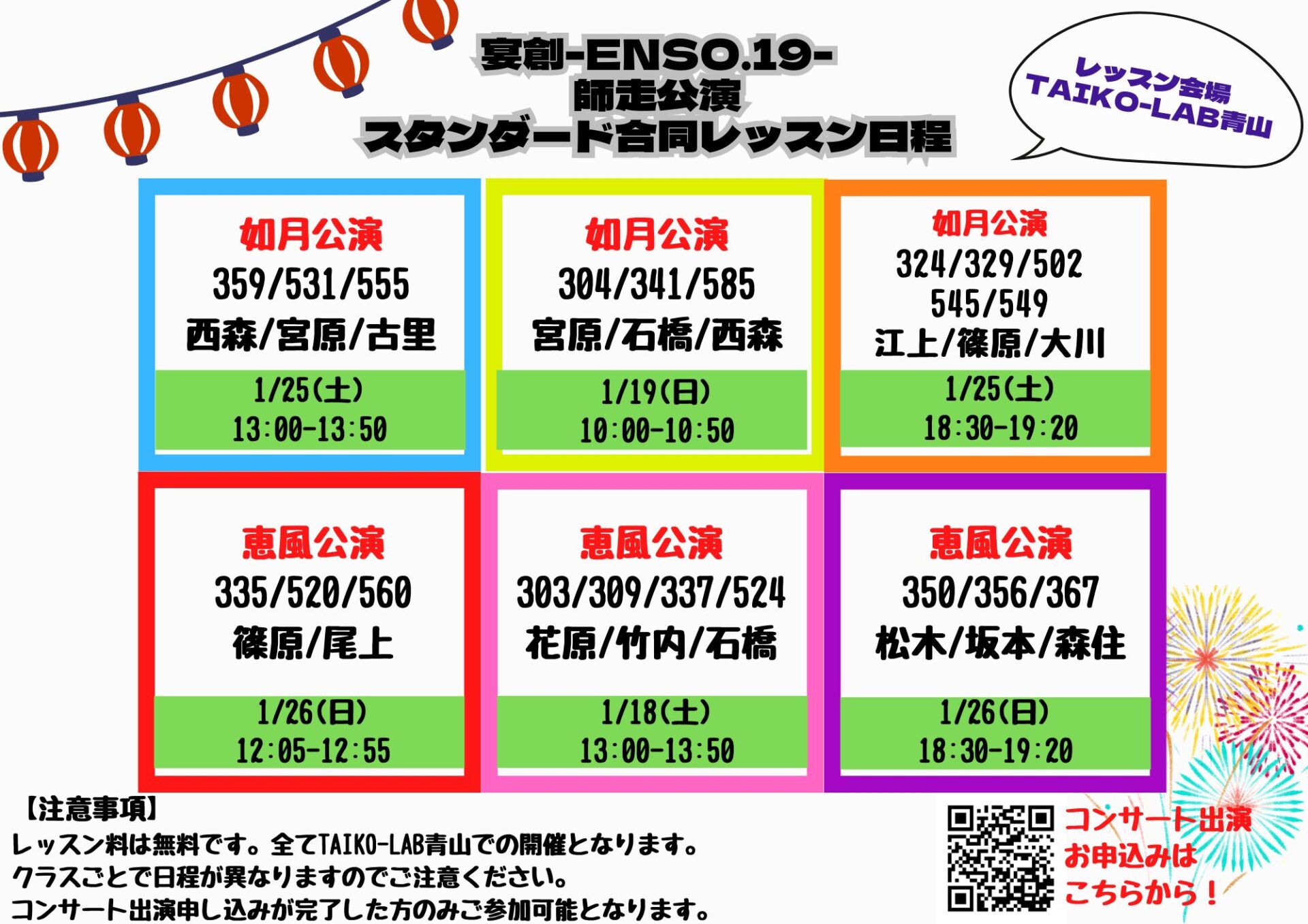 会場は全てTAIKO-LAB青山、日時はクラスごとに異なります。