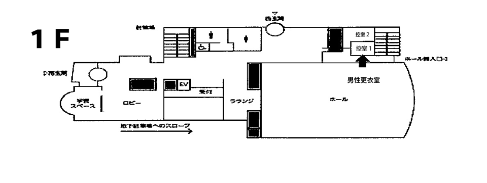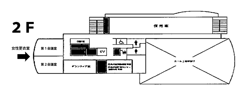 女性更衣室は館内2階「第1会議室」、「第2会議室」です。